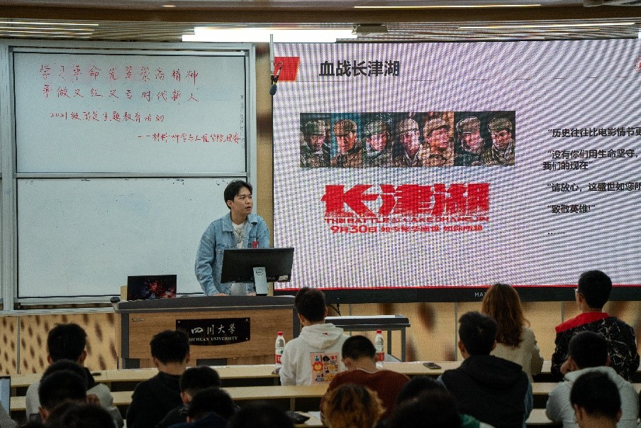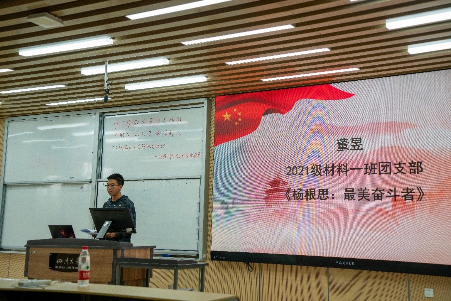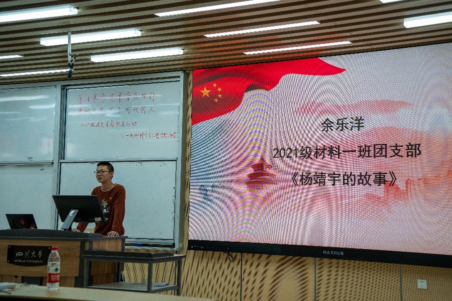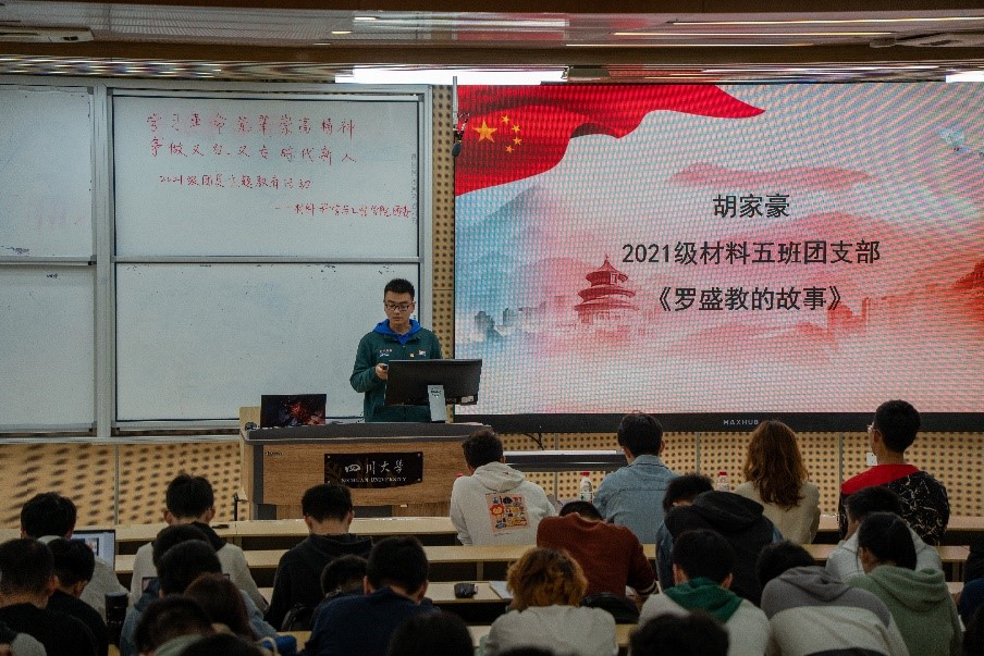 然后青年讲师团成员于世博进行主题授课。于世博同学分享了王右木、刘伯坚、江姐等革命先烈的感人故事,赞扬了革命先烈勇为革命事业奉献的大无畏精神,各位团员获益匪浅。