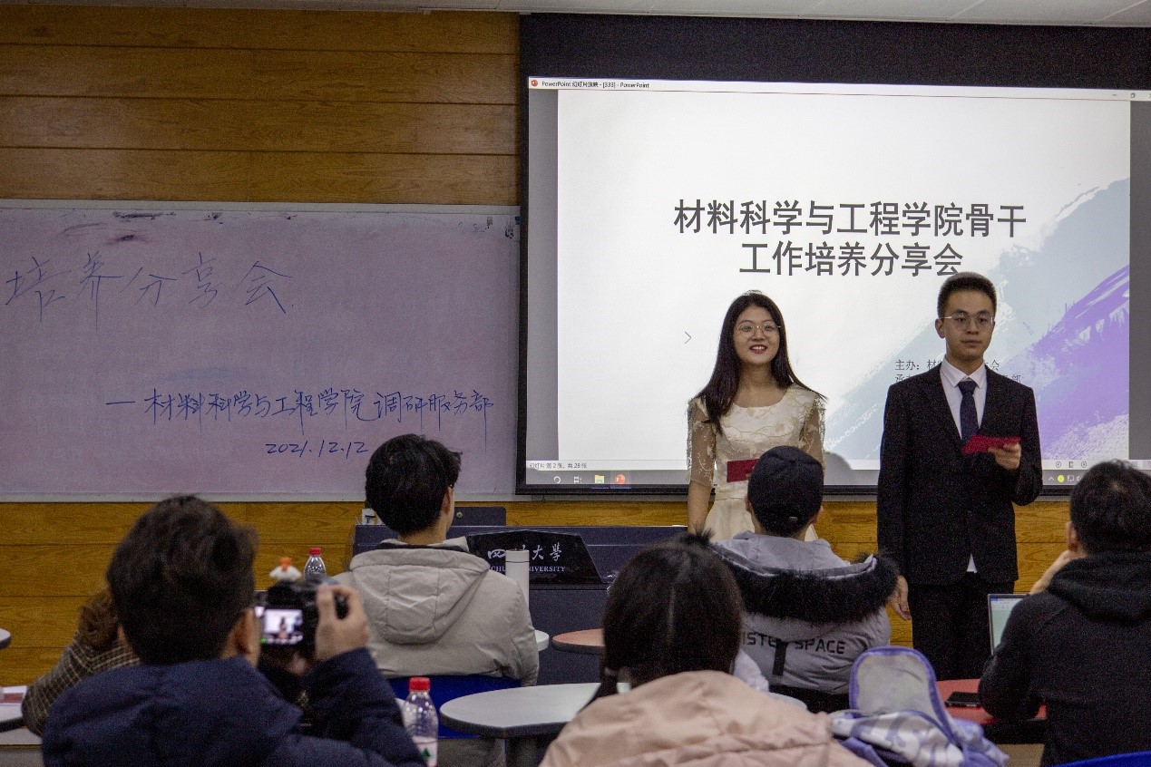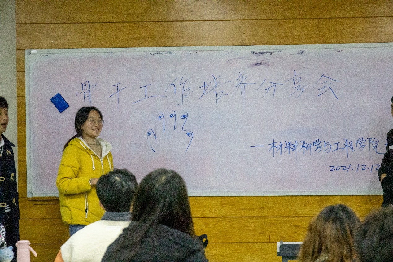 学生干部是学生活动的组织者和领导者,需要具有较高的思想 觉悟、业务能力。为了提升学生干部的相关工作能力,材料科学与 工程学院团委组织开展干部培训大会,特别邀请资深学生干部分享 学习工作经验。希望新一届学生干部以此为契机,能在学习和工作 中不断提升自我,在以后的工作中再创辉煌。