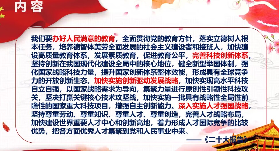 简短的开学典礼之后,主持人宣布第二次行课正式开始。主讲嘉宾余鹏飞老师以“悟二十大精神,做新时代青年”为题展开本次授课。余老师在课上详细介绍了党的二十大报告关于教育科技的论述及内涵,分多个方面解读——办好人民满意的教育、完善科技创新体系、加快实施创新驱动发展战略、深入实施人才强国战略。